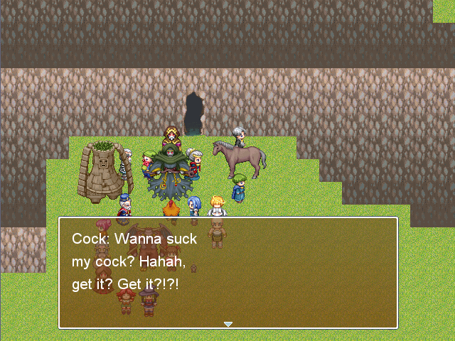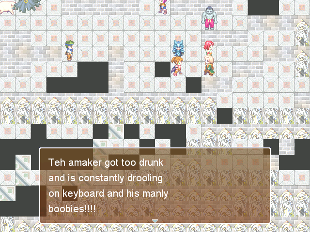 I sincerely enjoy these types of games way more than i enjoy serious, full-blown rpg maker games. The former have some sort of anesthetic effect on me,a mistifying, mesmerizing sort of effect. They make me shut off my brain and forget about details because i know i'm playing crap anyway so i may as well keep watching the trainwreck to see what cheap laughs i can get out of it.