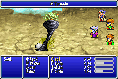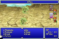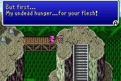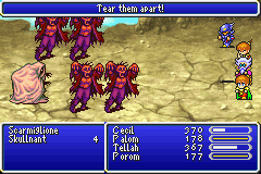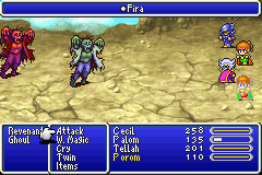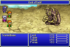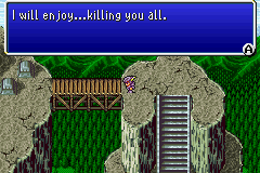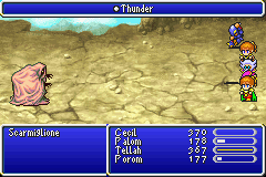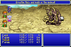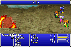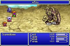 This battle isn't too hard at all. The Zombies cast Drain over and over (which doesn't do much damage), and Scar himself just casts a bitch ass Thunder over and over again. A Bluffed Fira from Palom and a Fira from Tellah clears the enemy part down to just Scar here.