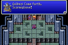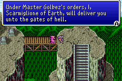 Golbez calls up some minion of his, and it's none other than one of the Four Elemental Fiends. In the original, his name was Milon (which never really made sense), but in the retranslation, it's now Scarmiglione, which makes sense for the Dante's Inferno theme you'll see later.