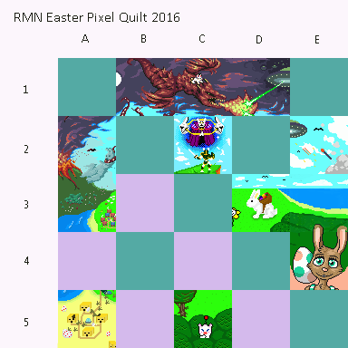 Not a lot of Easter happening in this quilt so far, though I can't decide whether that's a good thing or a bad thing. I wonder how hard it would be to draw E5 such that the giant bunny is emerging from a tomb after three days.