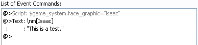 author=NoblemanNick link=topic=2268.msg38879#msg38879 date=1224423135Yeah, they're in there and I'm telling it to show the right one. I took a VEEEERY basic Ruby tutorial that I never finished, and what it's telling me is that it doesn't know what to do with "face_graphic=". So yeah, it's a problem with the script.author=TooManyToasters link=topic=2268.msg38863#msg38863 date=1224386258author=NoblemanNick link=topic=2268.msg38849#msg38849 date=1224378904...Whew. Here we go.