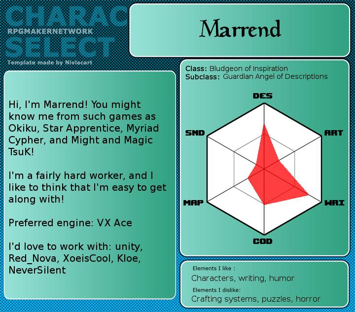 I make sprites, parallaxes, tiles, music, and I write. I also have a little experience with C# and C++. I've made a number of games.