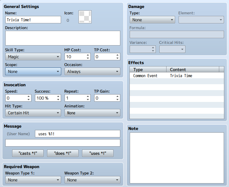 The MP cost here is 10 for a reason though. I gave enemies 10 MP and no other skills that use MP. This way when the enemy uses Trivia Time! they lose all their MP and can't reuse the skill. If you want enemies to use MP for other things I'd suggest looking into Yanfly's Limited Skill Uses plugin. With it you can set the skill to only be used once. Yanfly's plugin does require other plugins to work but they're all on YF's site there and all free to use.