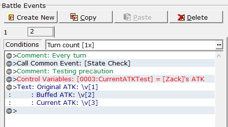 Next Event Page is setting the Turn Count to x 1, this means whatever code is in here will run every turn of the battle (including the start of the battle, but the turn 0 page will happen first regardless). I set a common event to State Check. Then afterwards a test variable that constantly checks for the Hero's current attack, then a test message that just keeps track of all the variables. The main thing is just the Common Event call though. Technically you could just dump everything you want to do in this one common event for most of the stuff you want to happen every turn, just something to keep in mind.