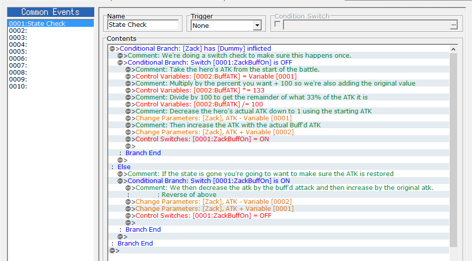Then make another conditional branch asking if the Buff switch is OFF, this is so that it'll only do the calculation once the state is added (don't need an Else for this).