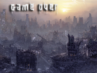Game Over Screen - I want a grassy hill, overlooking a good-sized Western Town. The tombstone should be facing away from the viewer, hiding any words carved thereon. It should be unworn and new (it's for the player if they die). There should be a sunset beyond the town on the horizon, preferably blood-red. A bit of lensflare would be great. Please, no signature here.