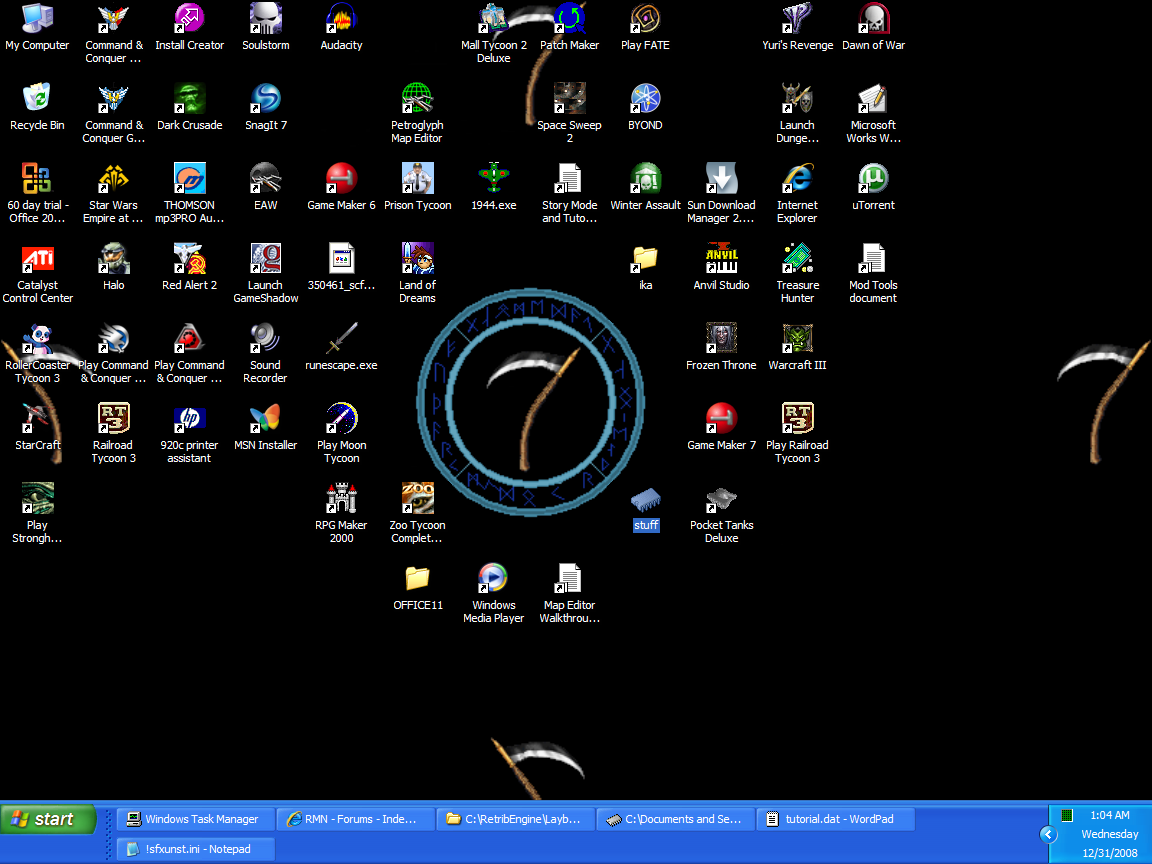Here's my current desktop. I had a problem with windows media player that resized the toolbar with I maximized the window, and thus scattered my carefully organized shortcuts everywhere. I really need to put them back in order.
