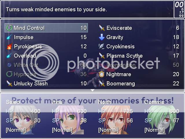 Should I just stick it in the skill window area and accept that it will slightly cut off the names of skills? Should I stuff it down by the battlers? Should I put this number in a box to make it more noticeable at the cost of obscuring even more of the screen, or should I just drop this gameplay mechanic entirely because it would look terrible?