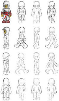 the big problem I have is that I don't know how to do stuff like folds and creases and I haven't been able to find a decent tutorial for those, and without them all my pants look like they're made out of plastic. I tried again on the legs of the first sprite is this any better? The arrow is supposed to be the angle the light was coming from