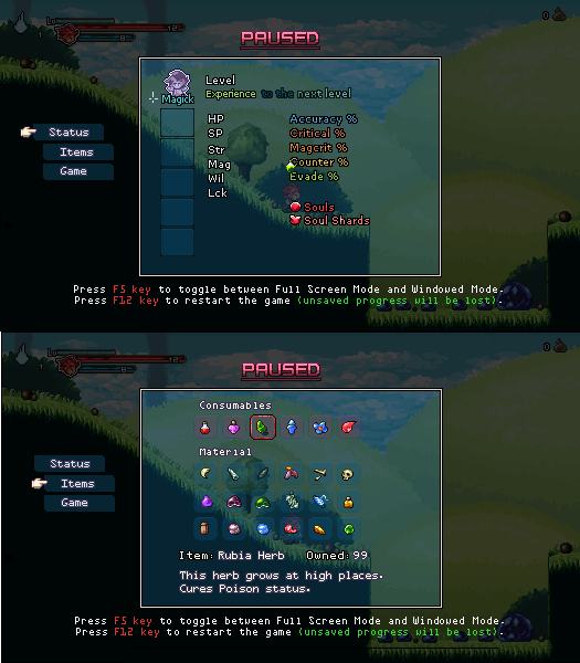 I am working on some very simple menus, there's not much options, not even equip in this game... (I destroyed that metroidvania-ability-complex menus yesterday! No more metroidvania game! i am sticking to something more generic as classic platformer with RPG elements) and I have to re-create menus again x_x.