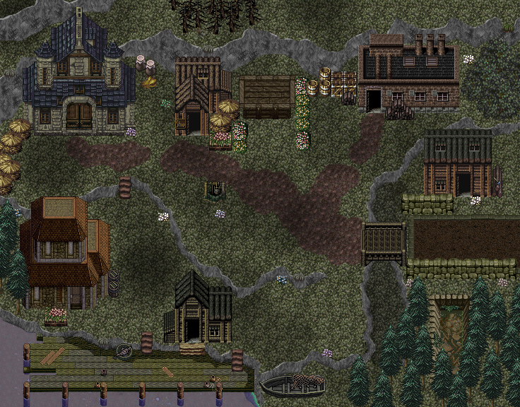 Why is there a bridge over such a small ditch... walking around it would take a couple more seconds. The cliffs don't show depth very well, but I guess it's easier to see ingame. I don't really understand why the water in the left bottom corner is lighter in the deeper part, and the bright blue line along the cliff doesn't go with the rest of the shade of the water. What is the wooden thing supposed to be that's between the 2 houses in the northern part of the village? I also don't know the the thing in the south east bottom is supposed to be... is it another ditch but with walls made of wood and plants growing in it?