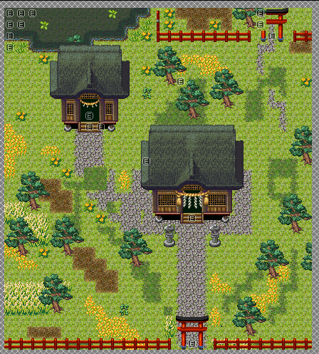 Still though...it's not bad! Though fixing all of those events for this map and the ruins version was a pain in the arse. Ugh...also kept forgetting abou thte top of the roofs for some reason. Never could figure out why they looked weird to me...now I know! Also, for some reason I never noticed that A) The donation box is INSIDE the shrine, so for this version, that's where it's at, though in the ruins version, it's right outside the entrance, and B) there aren't any porches. I could've SWORN there were some porches...oh well!