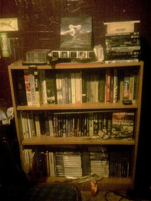 My book/dvd/game/VHS!!-shelf in super-grainy crappy phone-camera.