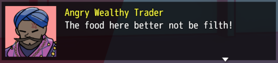 And what's a tavern without patrons? There aren't any named "regulars" that frequent the tavern (e.g., that rascal Jorji from Papers Please), but we get a mix-and-match for different types of customers (like farmer and trader) and various moods (like cheerful and drunk).