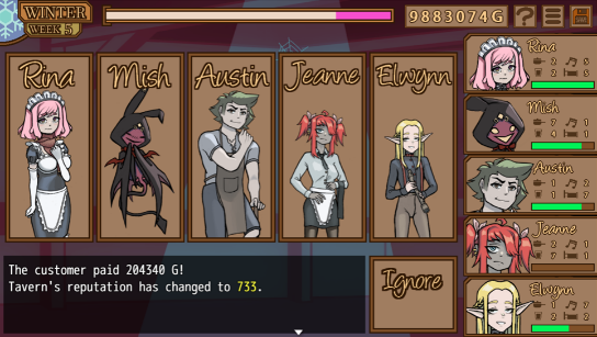 The actual management phase is as easy as clicking a button on the nice UI and praying to RNG. That is, an event occurs, such as a customer ready to order or a local crisis occurring. If it's a customer, figure out what they want by reading the text. Or bandits attack. Whatever the case, click on a worker to have them deal with the event (the game waits for a decision, which is nice), and they'll deal with it and expend some health. The patron pays up and the tavern reputation (which I assume is a multiplier for payouts) is recalculated based on the character’s skill level for that type of event.