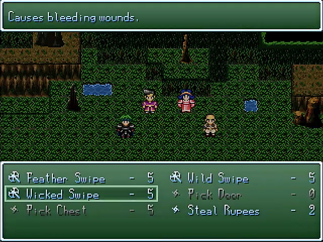 What alse? Well, no random encounters but wandering monsters that can be avoided (a real good addition to Rm2k base system) and the possibility to save anywhere (always appreciated!).