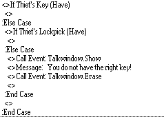 Finally, below that last conditional branch (where the code for broken lockpicks reside) you need to copy/paste the code from the <cancel> option we made earlier in the tutorial. Finally, the common event should end up looking something like this: