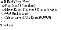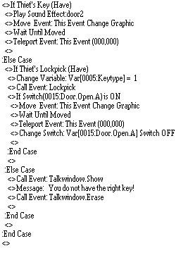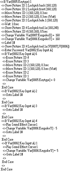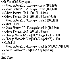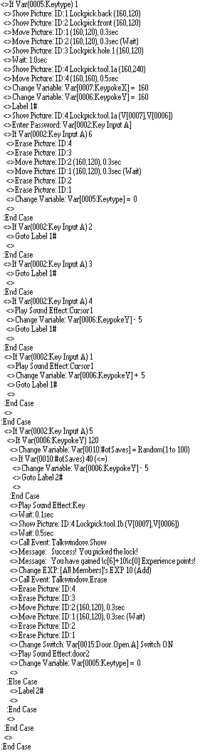 So thats it! You have now coded a basic lockpicking system. Though limited and somewhat rudimentary, this system can also be customized with relative ease. You should be able to add a lockpicking skill system with little effort, and have it decrease the failure and break odds as you see fit. You should also be able to create different lockpicks for different locks if you want to, simply copy/paste the door event and assign a new door graphic. Maybe add some more notches to the lockhole. Additional doors would be best served using other values for the Keytype variable (thats what the variable is for anyway). Simply copy/paste all the code in the common event and change the Keytype to 2 on the copied branch code, then make whatever customizations to the additional door that you wanted.
