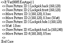 First, create a conditional branch That checks if Variable Keytype = 1. No else case. Now its time to show the player your lockpicking graphics. For the sake of not writing a novel, I'm going to skip the exact animation steps I used, and let a screenshot speak for me. So create your starting animations. The idea is to have a picture of a lock and a lockpick/key device, and the player has to move the lockpick into the lock and press the <action> key at the right time to open the lock.