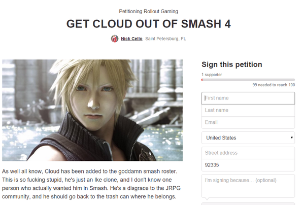 Entitled whining children. Not even supporting Cloud or anything, but I hope they keep him in just to piss those salt licks off, because I know Nintendo fans.