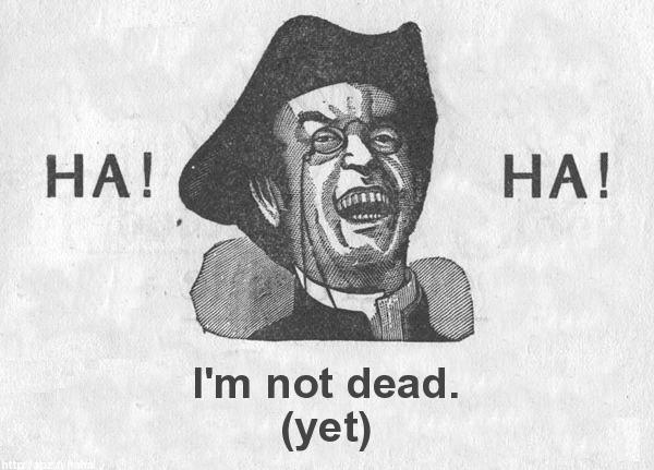 'Ere! He says he's not dead!