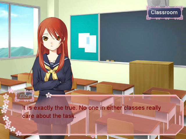 Base story: A few days after the bet, <player> class is called to a co-work with Miki's class, after, on his own thoughts, being lucky enough to avoid being paired with Nakajima, he's presented to Eliza "Shadow-wolf" Yamisaki, whose name caused a lot of buzz around the class, however, she doesn't seem to care about them, neither about him, and finish by taking the co-op notice on a skeptical, sourer note.