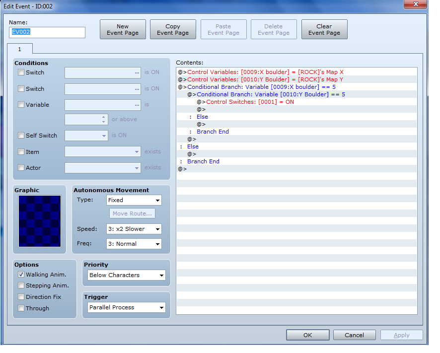 So I know this is a pretty newbie question, but I'm having a real hard time rolling a boulder on to a pressure plate. I know how to get the boulder to roll, but when I try to set the event to a Parallel Process and set the code, it instantly crashes saying,