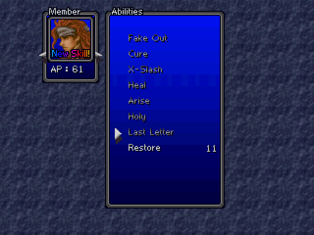 I'm liking your suggestion about the new skill. However the new skill text is animated and scrolls through a bunch of colours like the limit break text from FF7, but scrolling through 2 or 3 colours instead might be a little easier on the eyes.