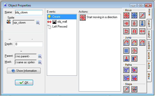 I just got Game Maker 7 Pro for making Fenrir II with and started with the tutorials on YoYo Games' website. Problem is, in my Catch the Clown game, my clown won't move!